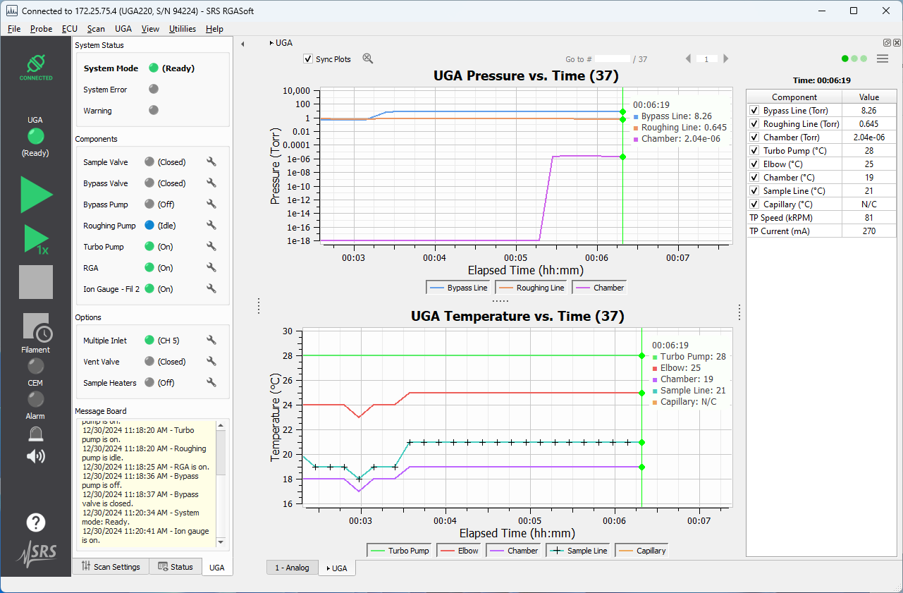 The UGA Windows software provides a graphical user interface for complex graphing and data analysis. The software also allows remote control of the system's valves, heaters and pumps.